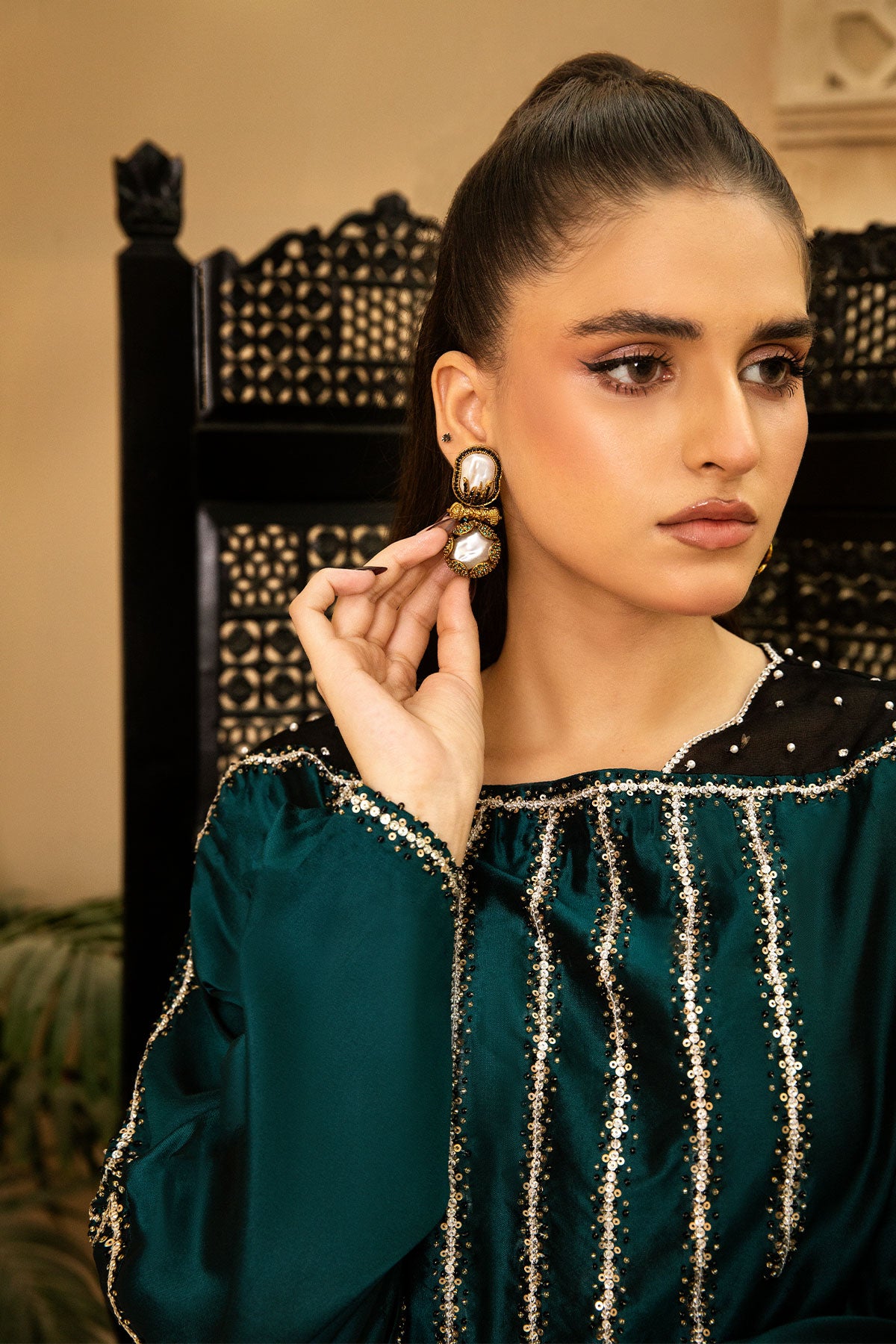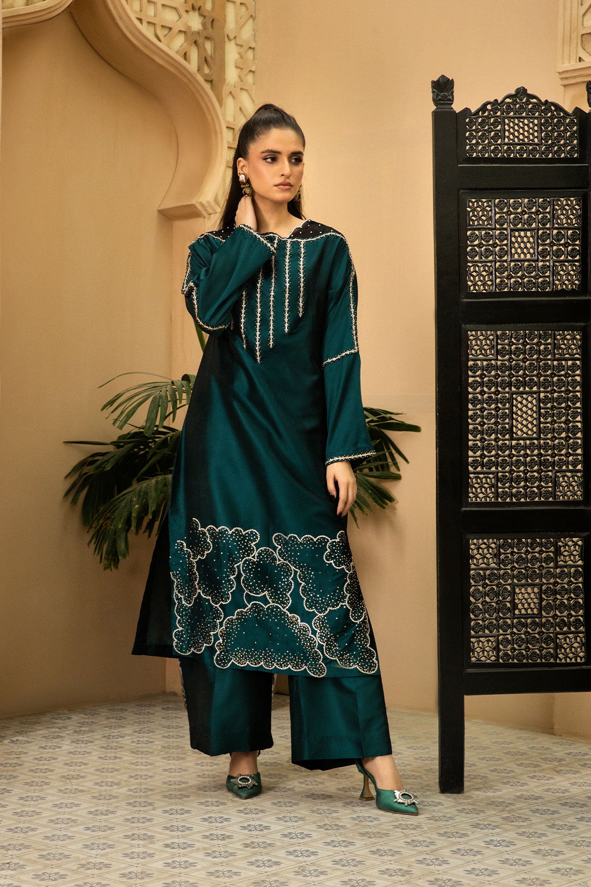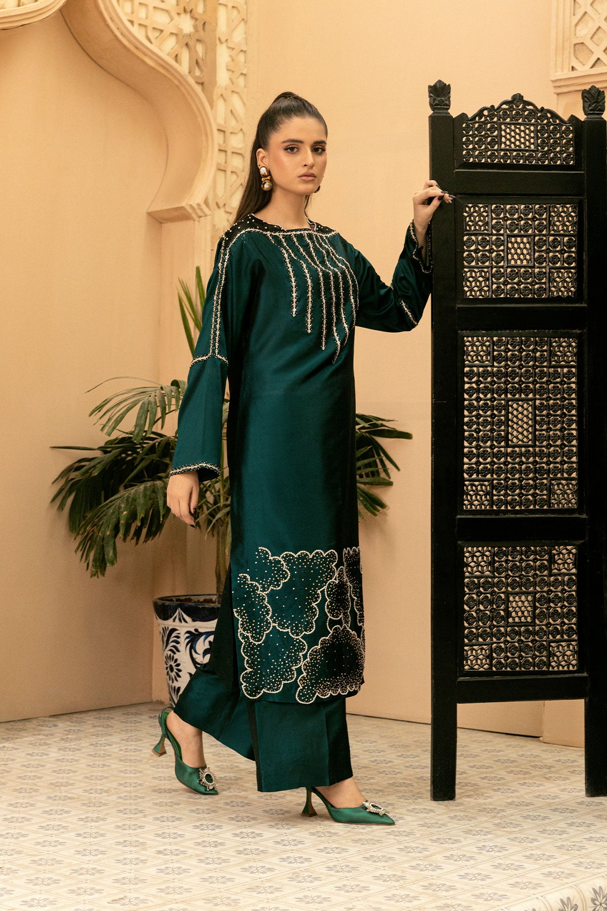 A luxurious sheesha silk ensemble in a rich green tone, adorned with intricate bead and stone embellishments that elevate its refined silhouette. The graceful craftsmanship and subtle shimmer make it a perfect pick for festive and semi-formal occasions.