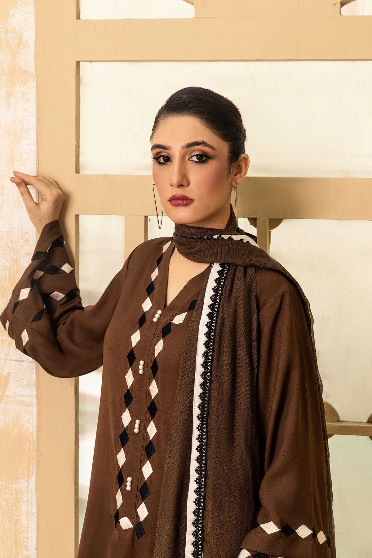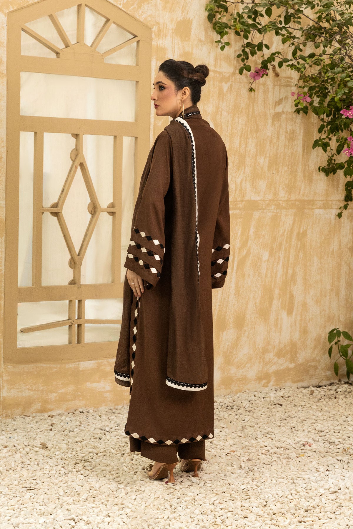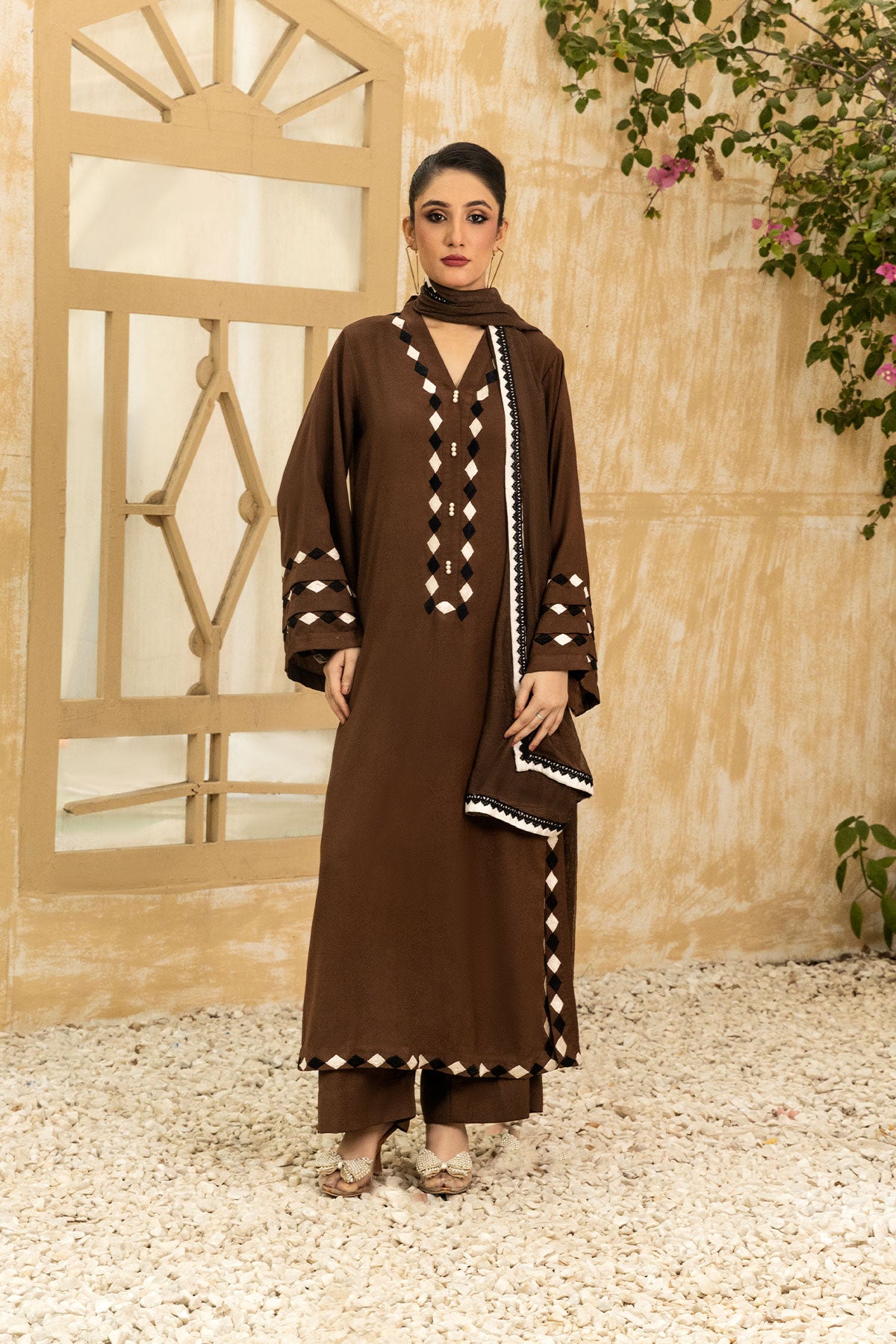 An elegant brown georgette ensemble featuring delicate machine embroidery that adds texture and grace. Paired with matching trousers and a coordinated dupatta, this 3-piece suit offers a timeless look perfect for both festive and formal occasions.