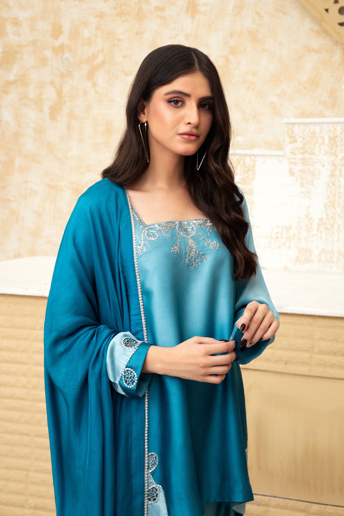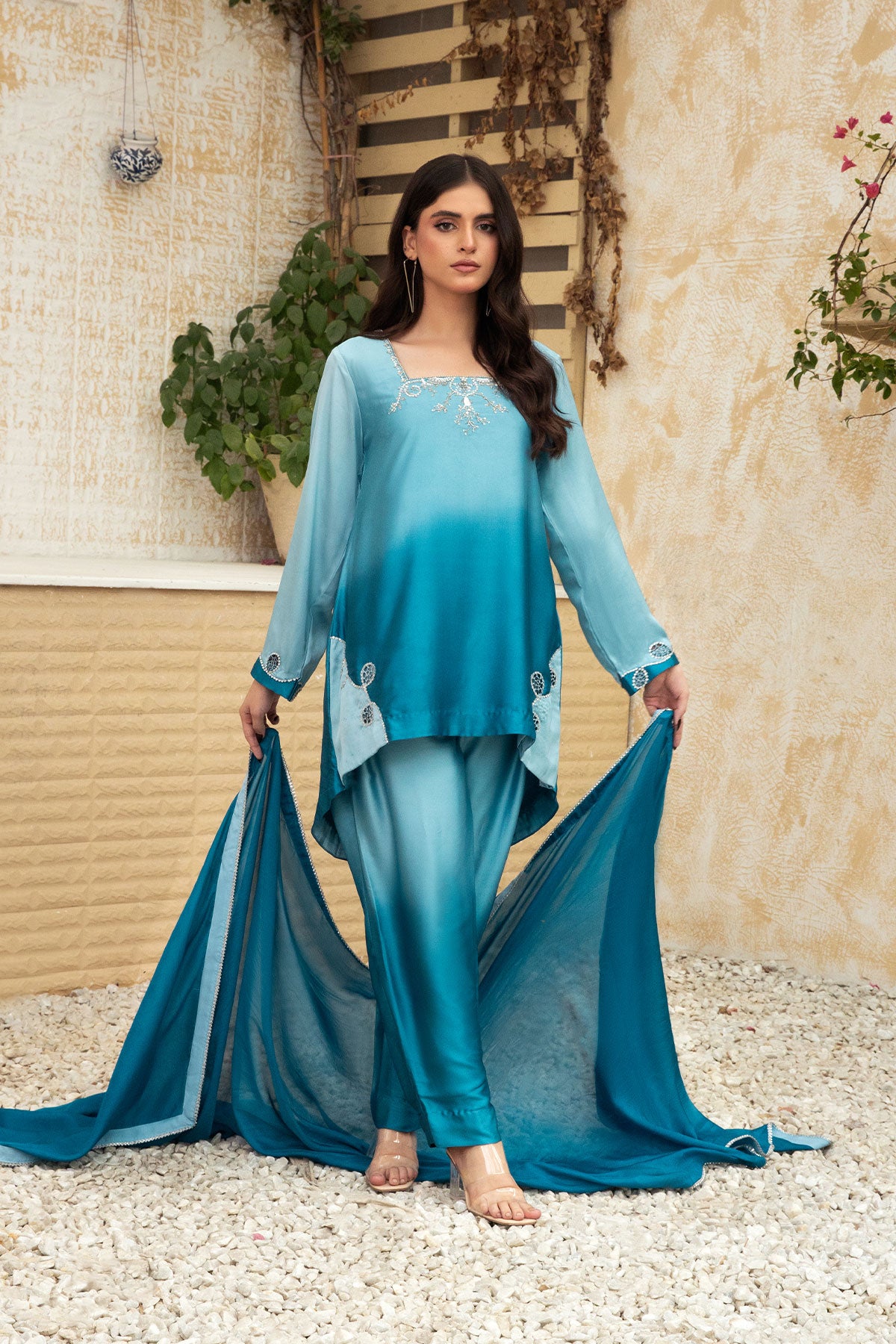 A sophisticated ombre-toned ensemble crafted from luxurious Korean silk, featuring a beautifully hand-embroidered shirt that exudes elegance and artistry. Paired with matching trousers and a graceful dupatta, this 3-piece suit is perfect for festive and formal occasions.