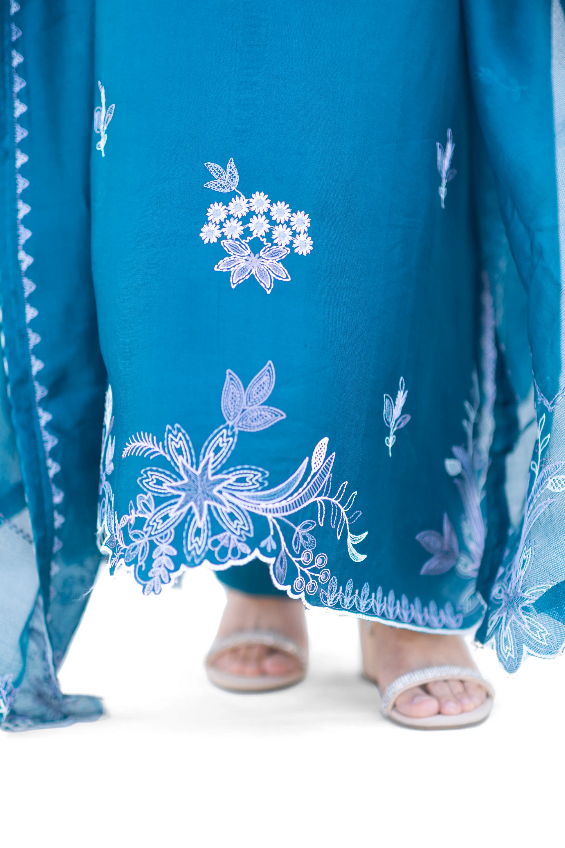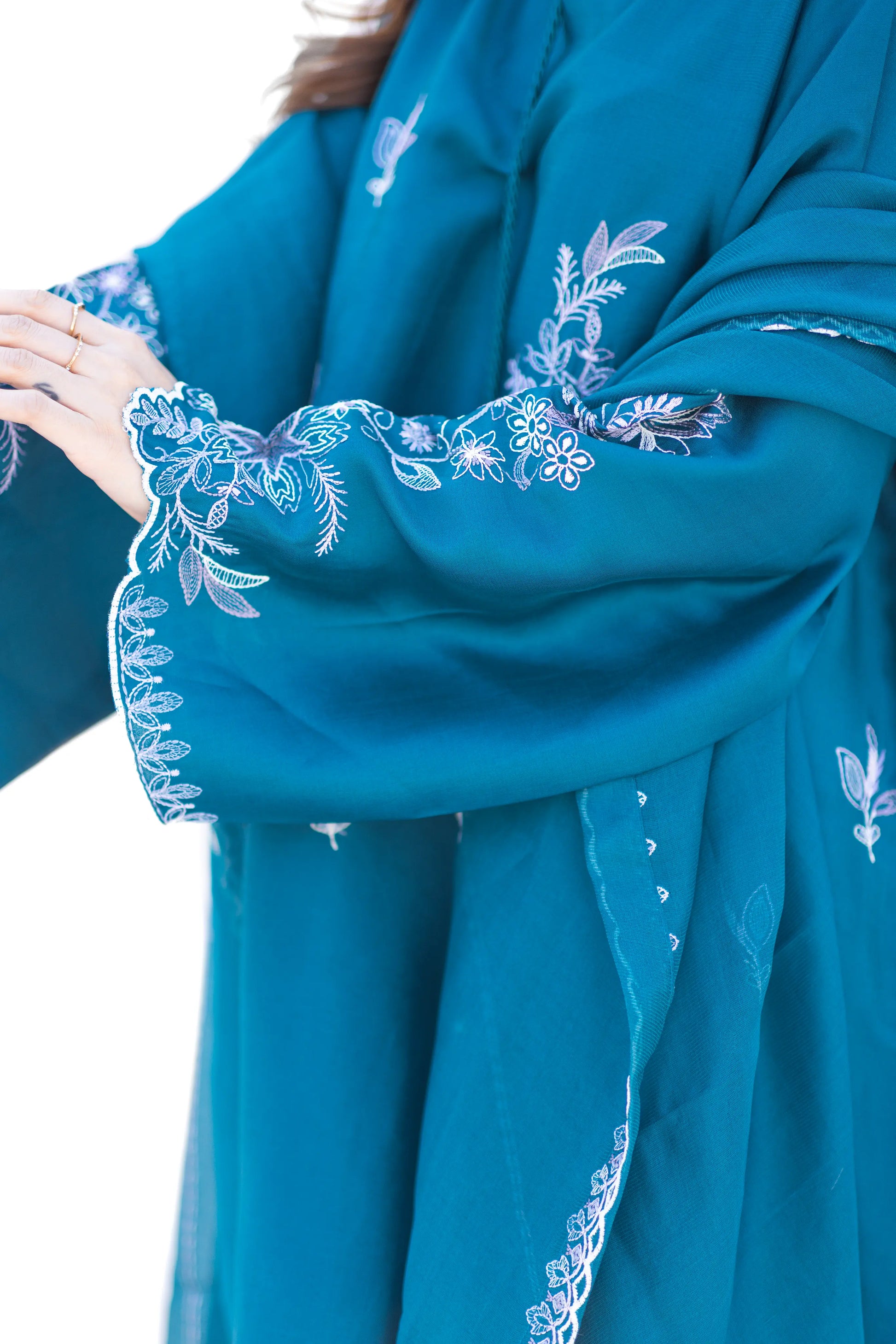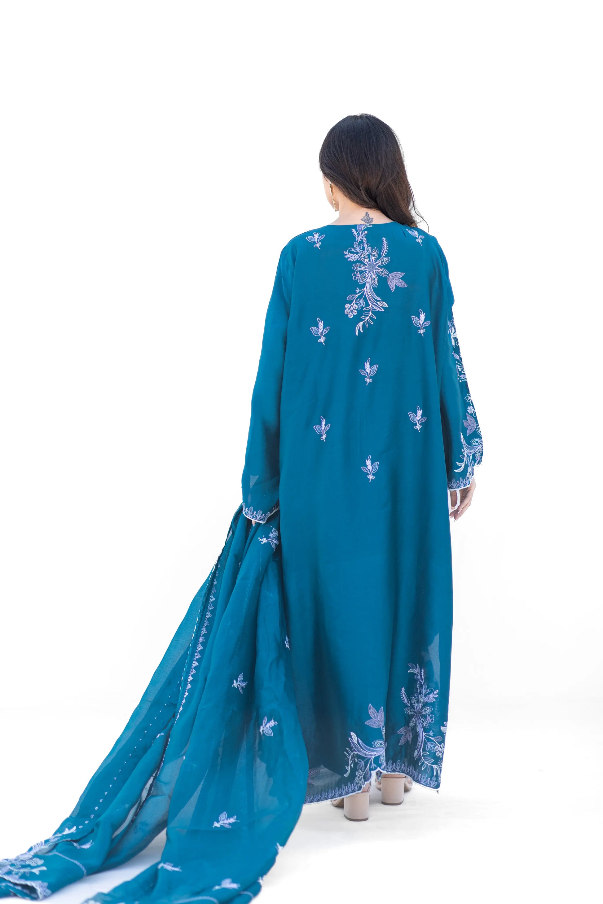Elegant teal kaftan in sheesha silk with intricate machine embroidery, paired with a classic shalwar. Finished with a kathan silk sheesha organza dupatta featuring delicate embroidered borders.