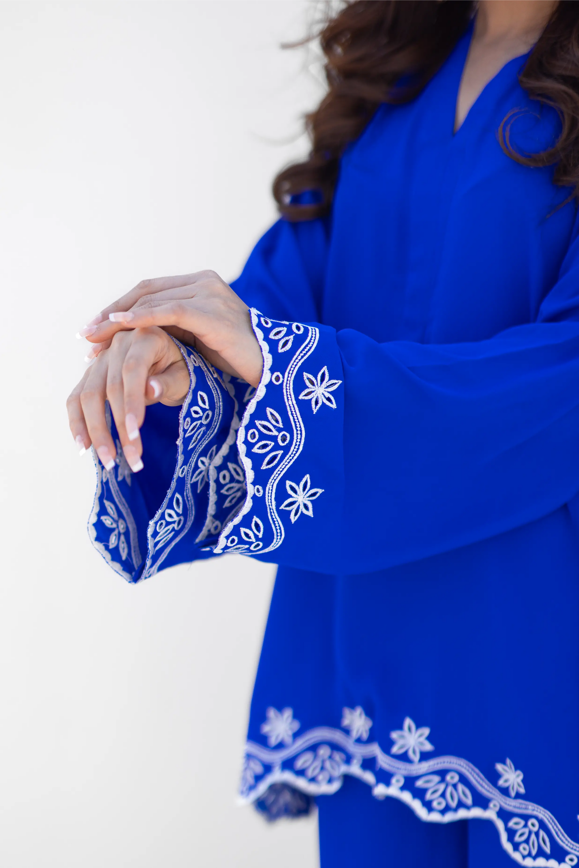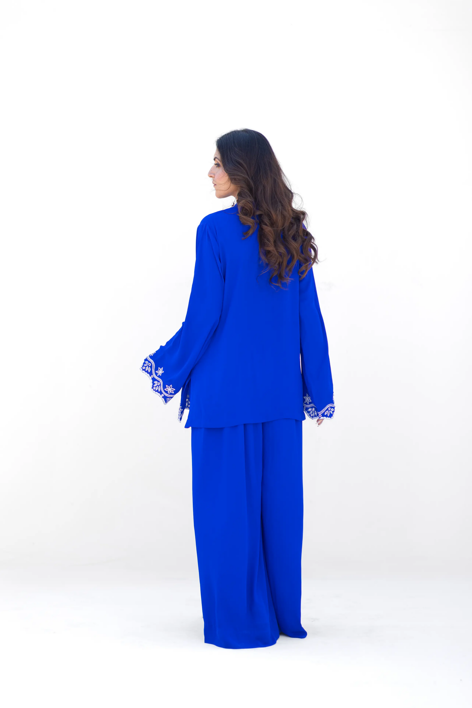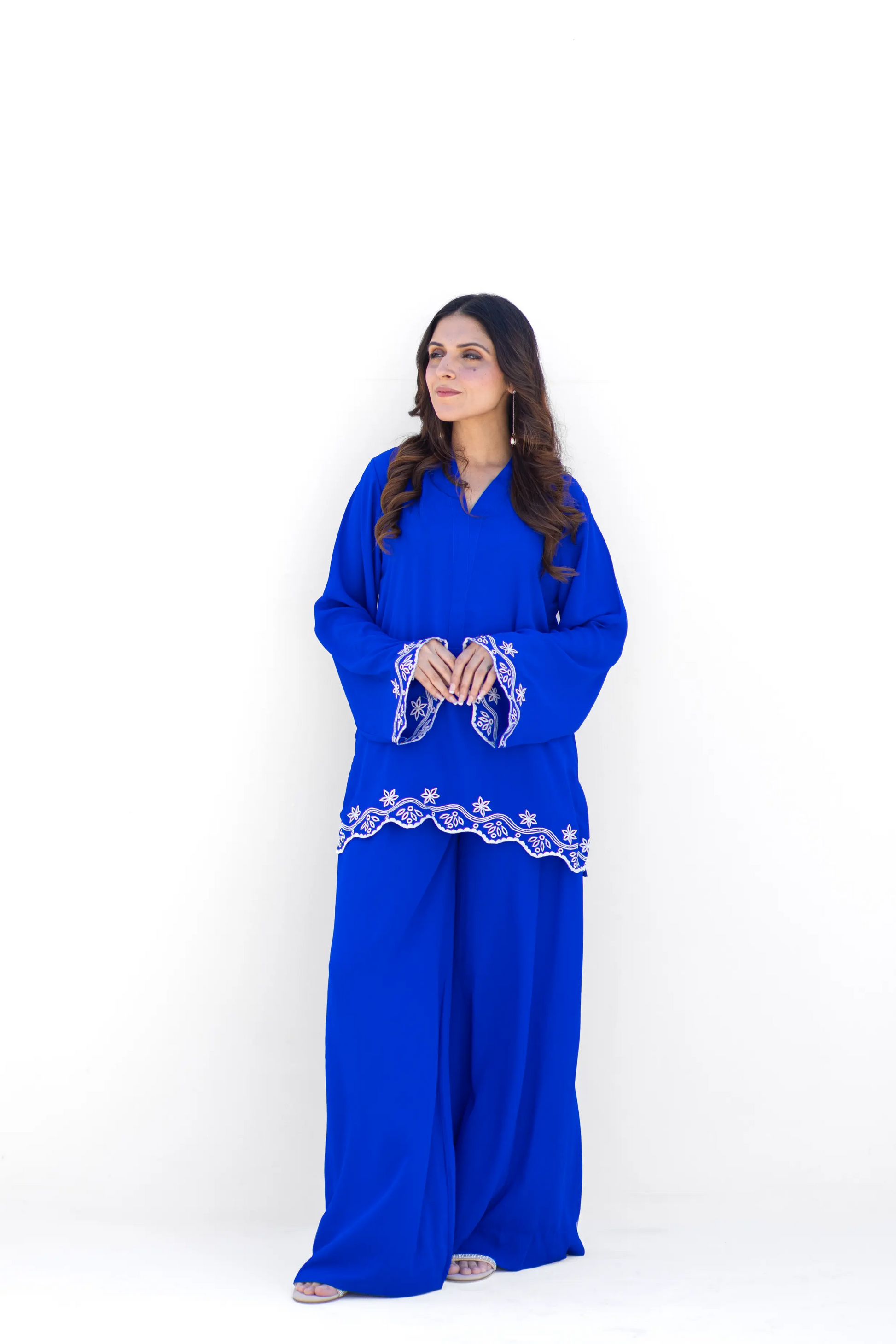 A graceful georgette short shirt paired with an elegant airline plazo. Designed with delicate machine cutwork embroidery on the sleeves and hem, this outfit offers a refined and modern look while keeping the silhouette relaxed and stylish.