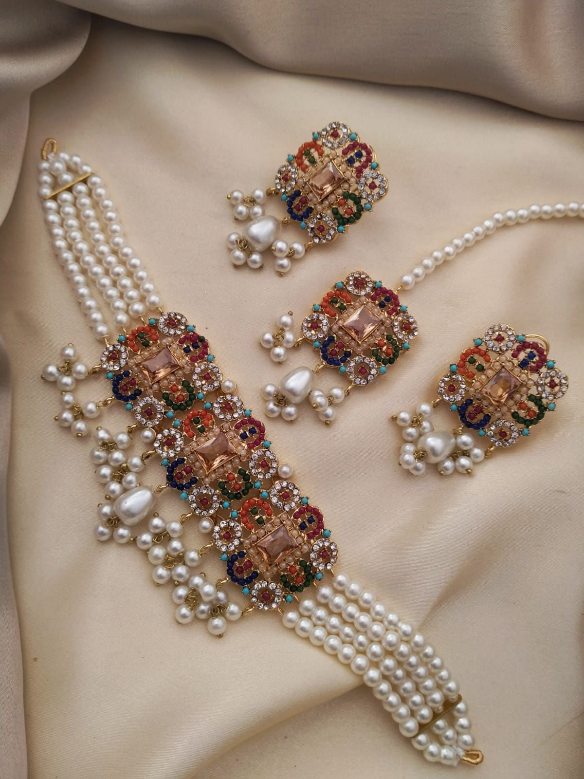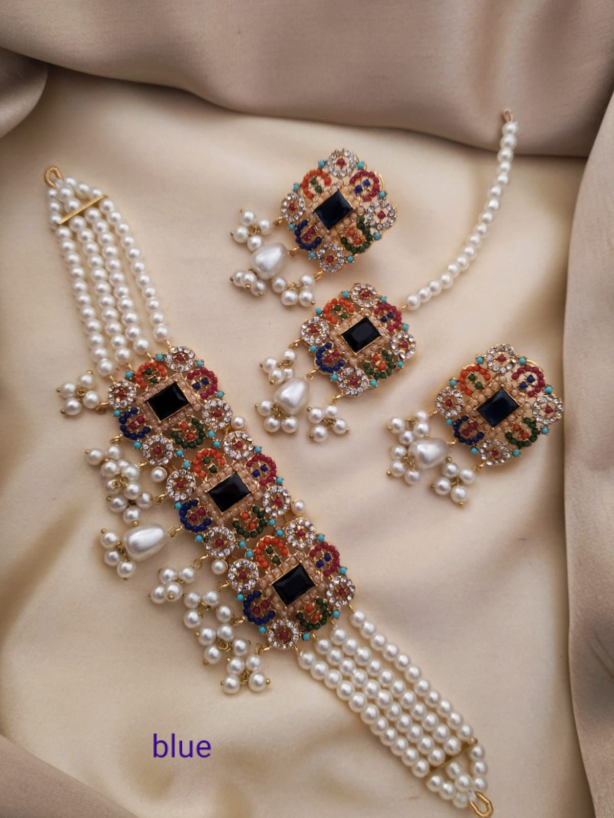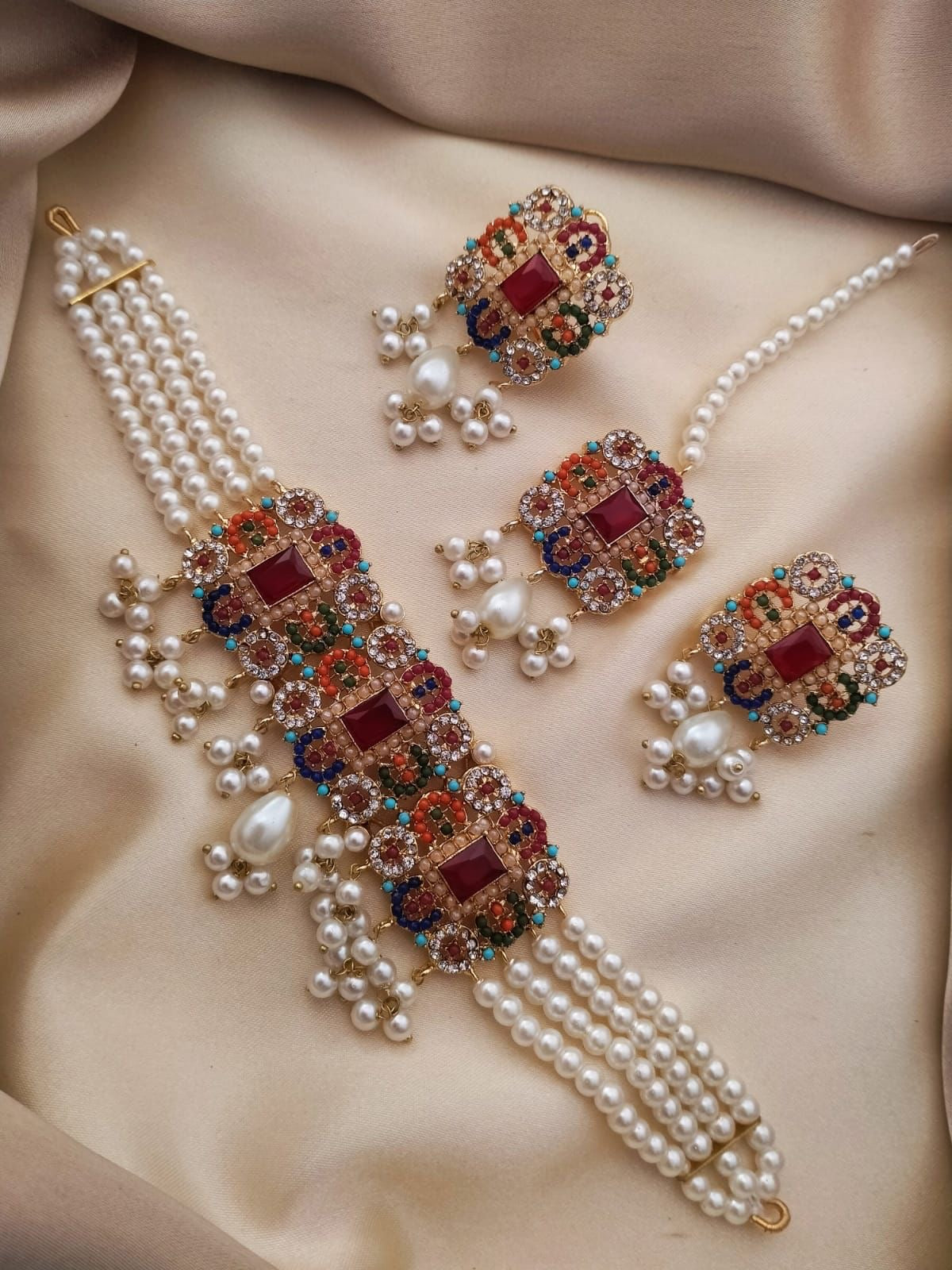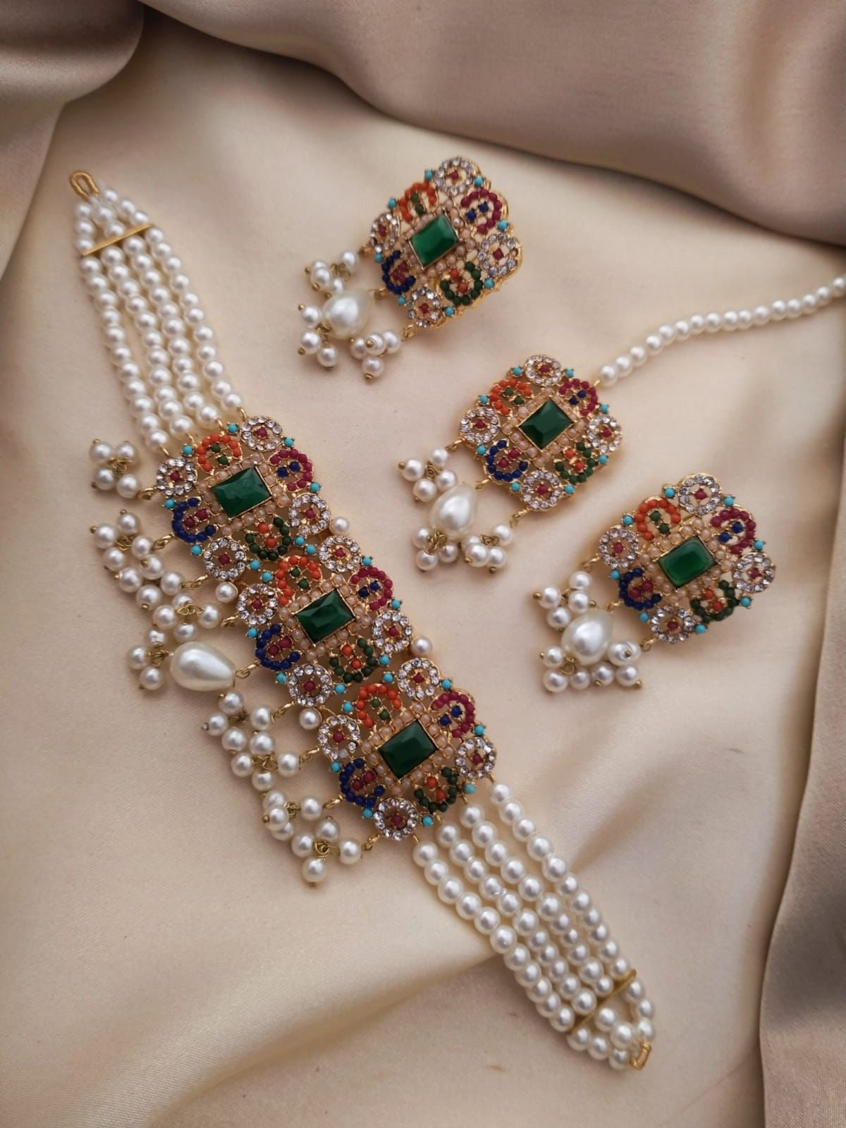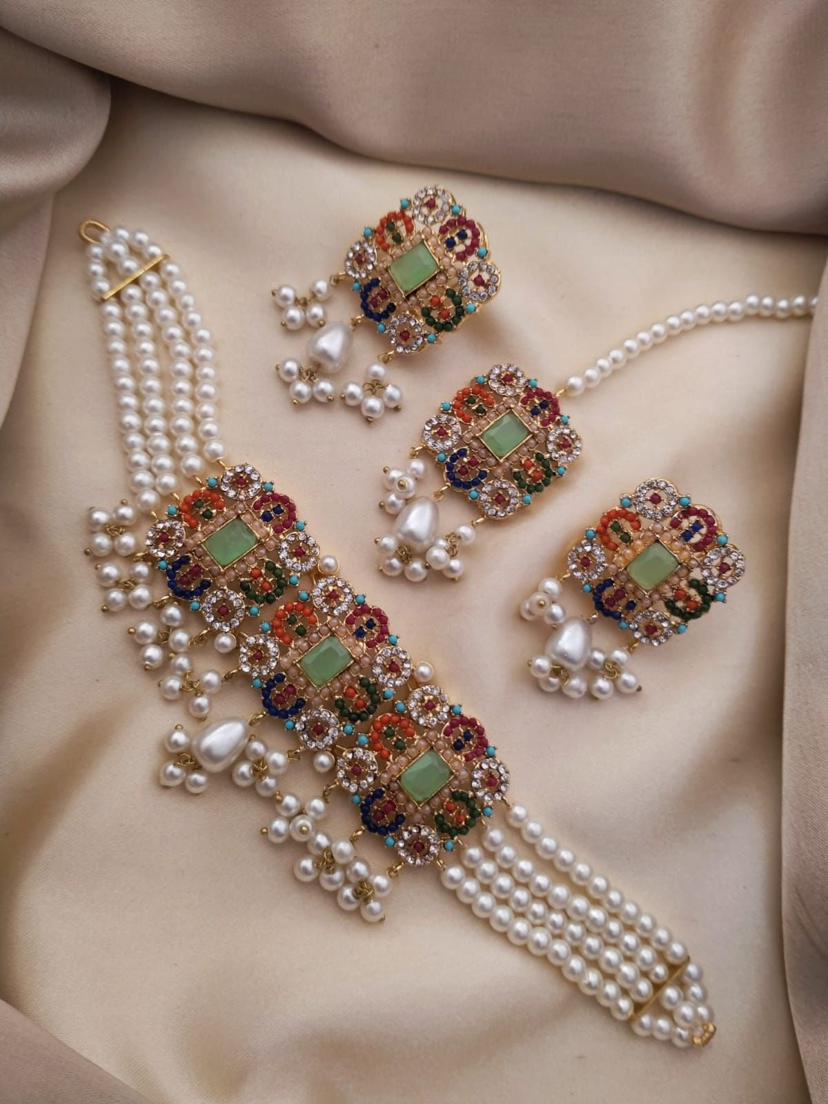 Adorn yourself with the timeless elegance of our Nauratan Chokkat set, featuring exquisite craftsmanship and a captivating blend of nine vibrant gemstones, adding a touch of regal charm to any ensemble.