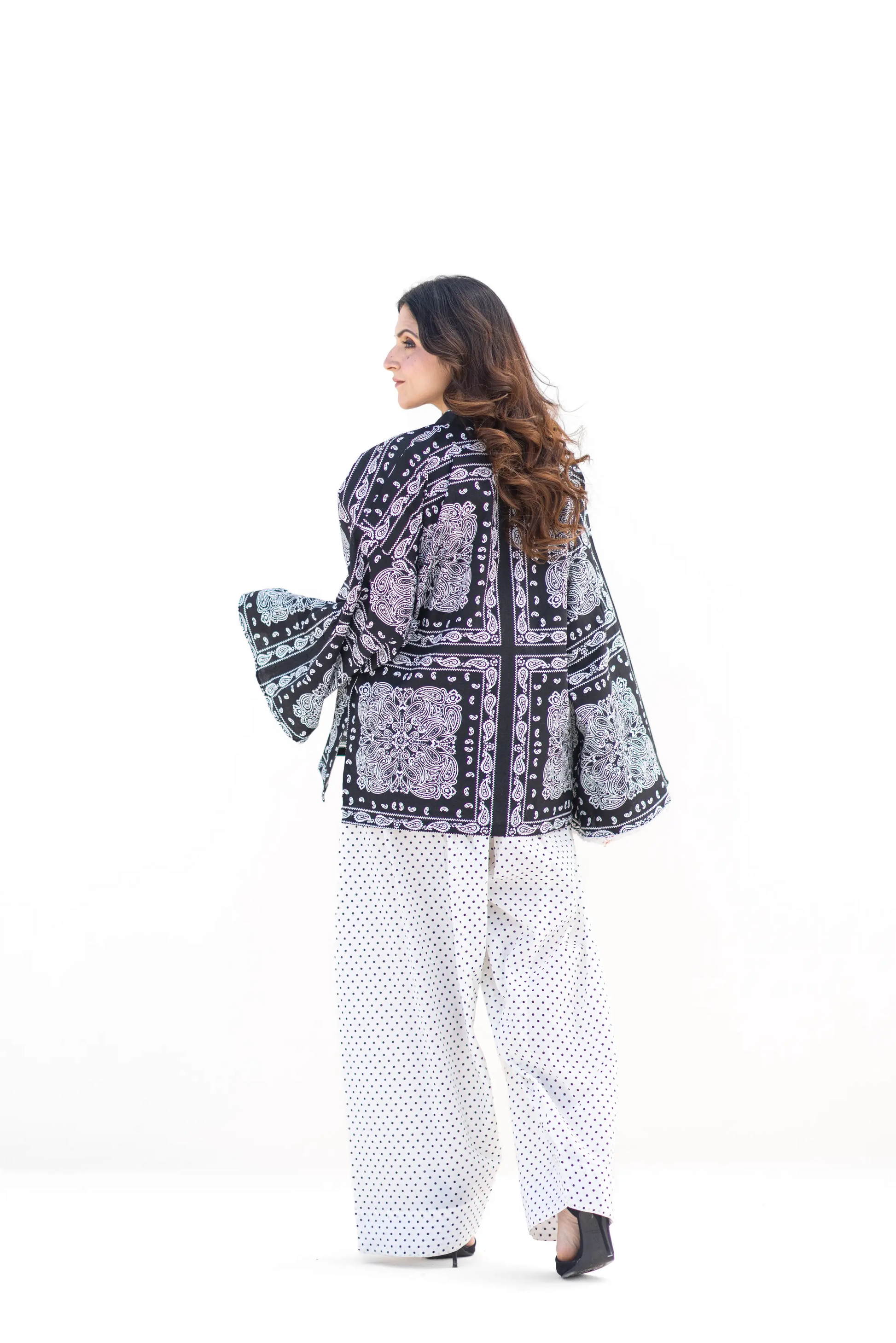 A stylish lawn short kurta paired with a chic polka dot shalwar. The black kurta features an elegant paisley print, giving the outfit a modern yet classic look. Made from breathable lawn fabric, this set is perfect for comfortable everyday wear.