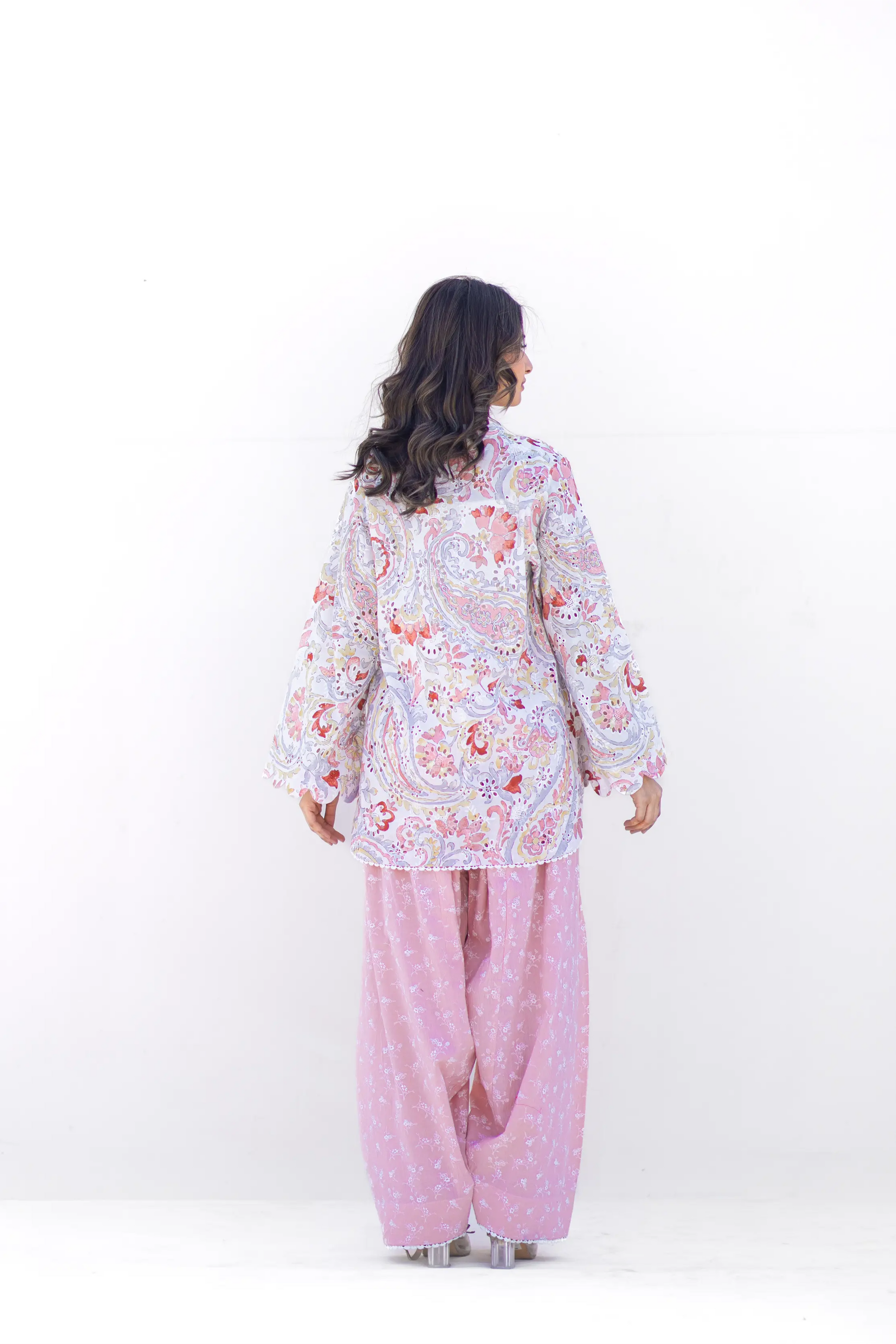 A graceful blend of tradition and charm, this chicken kari shirt features delicate detailing paired with a soft screen-printed farshi shalwar in blush pink. Light, elegant, and perfect for festive daytime wear.